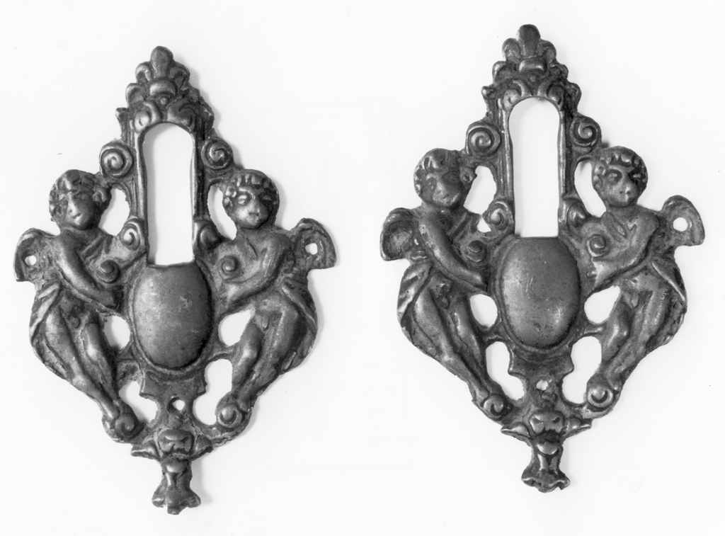 si tratta della placchetta esterna di una serratura della quale manca completamente il meccanismo di chiusura. E' decorata con due amorini che sorreggono uno scudo e che fanno da cornice al foro nel quale si inserisce la chiave