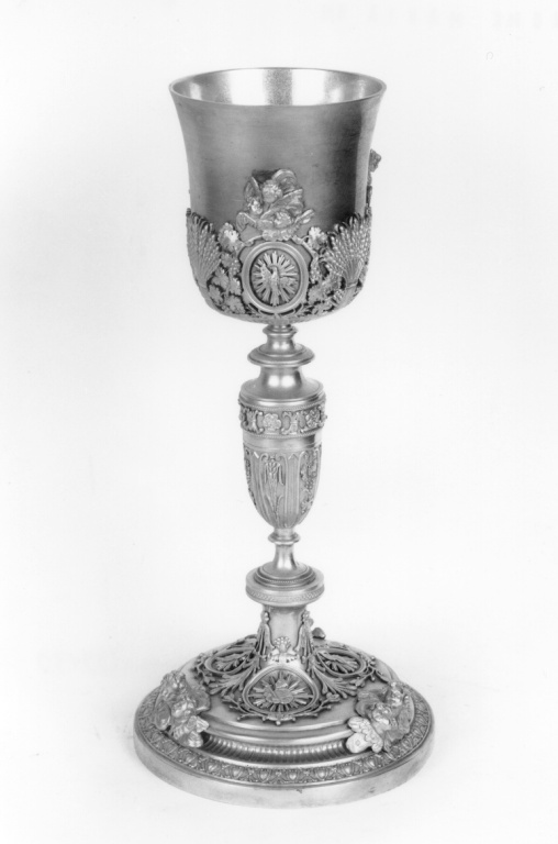poggiante su base circolare decorata da testa di cherubini e medaglioni con figure di santi applicata. Fusto con nodo ornato da spighe i grappoli d'uva; coppa svasata e sottocoppa ornata da fasci di spighe e grappoli d'uva, cherubini e piccoli ovali con simboli trinitari