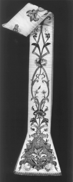il manufatto presenta una ricca decorazione alla base che si sviluppa, per tutta la sua lunghezza, in una girandola di fiori e racemi