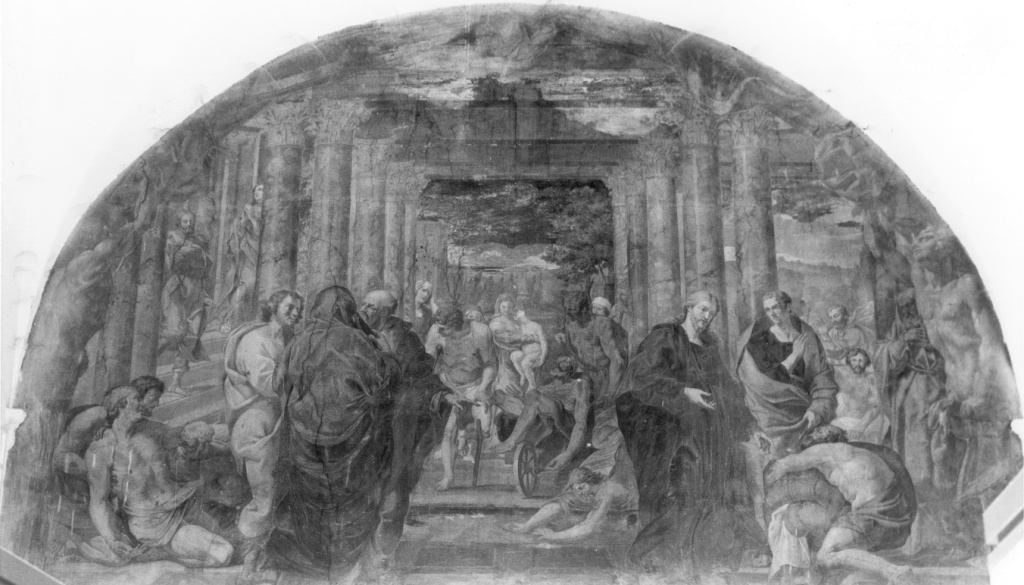 Personaggi: Gesù Cristo. Figure: paralitico; storpi; figure maschili; figura femminile con bambino in braccio