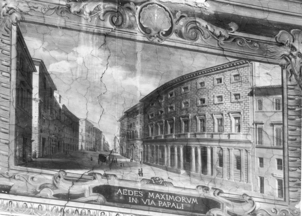 - ISCRIZIONI nel cartiglio in basso al centro - Aedes Maximorum/ in via papali - lettere capitali - a pennello - latino