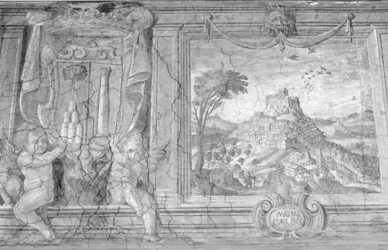 - NOTIZIE STORICO CRITICHE Montecelio già Monticello è l'antica Corniculum, situato sui colli Cornicolani. Nel X secolo apparteneva ai Crescenzi, in seguito fu degli Orsini, dei Della Rovere e nel 1549 venne acquistata dal cardinale Federico Cesi per 5000 scudi. Rimane in possesso della famiglia Cesi sino al 1678 quando Federico Angelo Pierdonato lo vende al principe Giovan Battista Borghese (cfr. Martinori, cit., pp.91-92). Il castello ben evidente nell'affresco fu distrutto dai francesi nel 1798