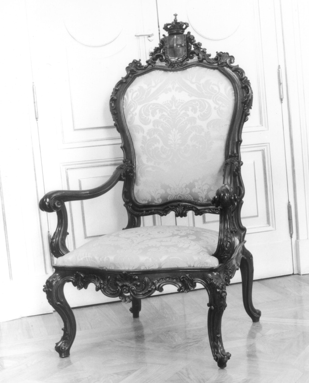 schienale sagomato centrato da scudo con stemma sabaudo sormontato da corona reale tra foglie e rocailles, braccioli a riccioli, gambe mosse con decori a pendone