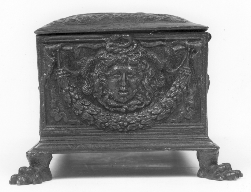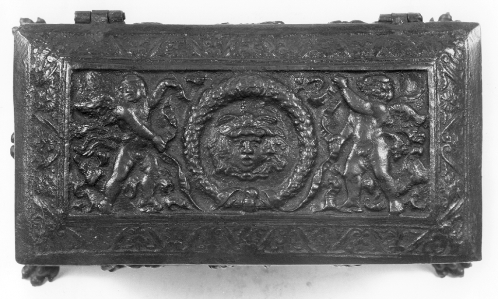 l'opera è uno scrigno che ha funzione di calamaio; presenta, sulla fronte e sul retro, una decorazione con centauri e cornucopie, e al centro, l'arme dei Malatesta di Rimini. I lati minori sono decorati con volto di Medusa entro una ghirlanda fiancheggiata da amorini. Il coperchio è decorato con geni alati e, tra ghirlande, una testa di medusa. Lo scrigno poggia su quattro piedi leonini