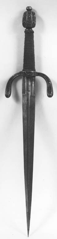 daga a mano-sinistra, solitamente usate nei duelli assieme alla striscia. Presenta una lama a sezione di rombo, sgusicata; tallone con tre scanalature, marcato. Elsa a rami piatti fortemente curvati verso la punta. Impugnatura coperta di filo metallico, pomo sfaccettato. Decorata a cesello con motivi floreali e cartelle con figure umane