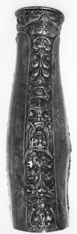schiniera sinistra incompleta di cui rimane solo una piastra, decorata a bande verticali sbalzate e cesellate e incise a motivi vegetali e grottesche