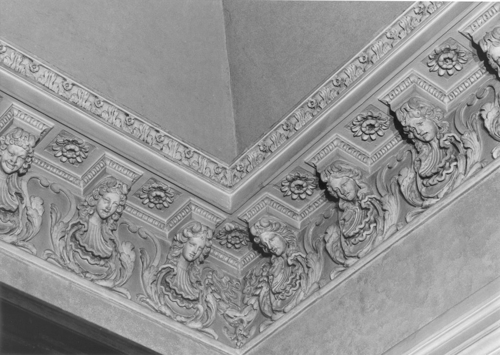 composta da fregio, in alto lungo le pareti, con ricco cornicione sporgente con mensole sostenute da teste feminili alternate a cassettoni, e, al centro della volta, da grande cornice mistilinea a diversi ordini, con decorazione a foglie e ovoli, quello più esterno con quattro anse a voluta ospitanti teste femminili