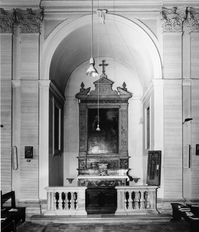 composto da mensa, gradino d'altare e dossale, con dipinto, inquadrato da paraste e sormontato da trabeazione e timpano spezzato con al centro targa con iscrizione; croce apicale