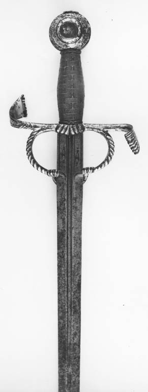 lama a sezione esagonale con due scanalature; elsa a rami patenti ricurvi all'estremità e archetto di guardia e archetto di parata formanti il "pas d'ane"; impugnatura ricoperta da fili metallici intrecciati a fascie; pomo a disco