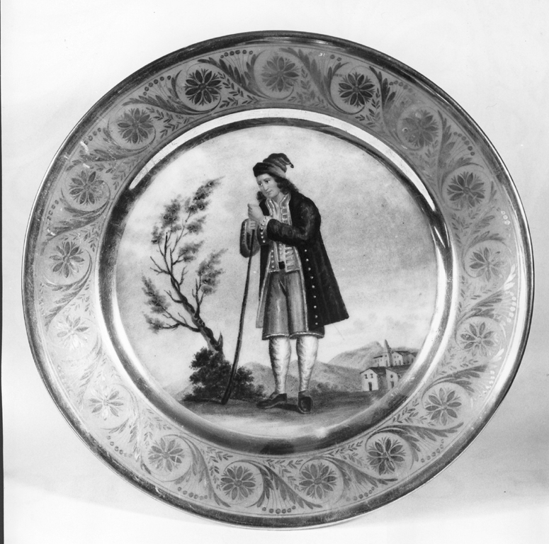 piatto circolare con tesa dorata integralmente decorata a motivo a girali vegetali; al centro, raffigurazione di uomo in costume popolare in un paesaggio