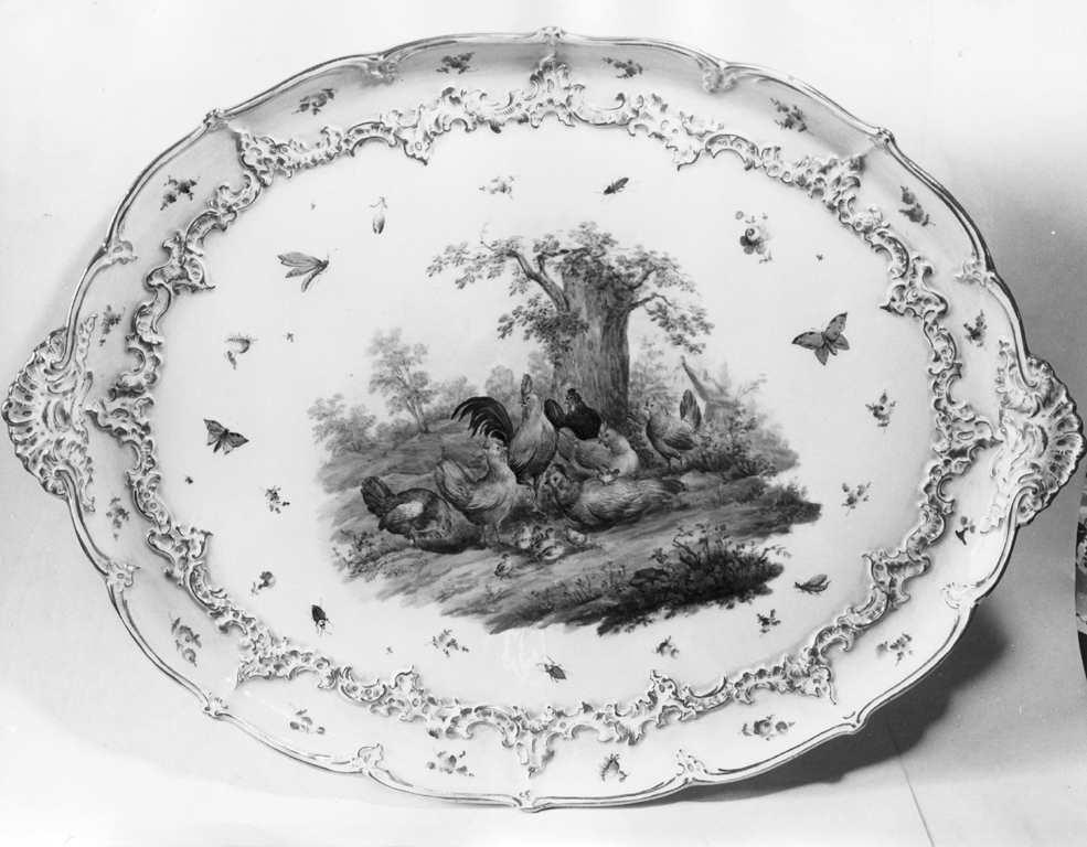 vassoio ovale con due anse a conchiglie e bordo sagomato filettato in oro e interno con decorazione a rilievo; al centro, raffigurazione di galli, galline e pulcini in un paesaggio contornati da fiori e insetti su fondo bianco
