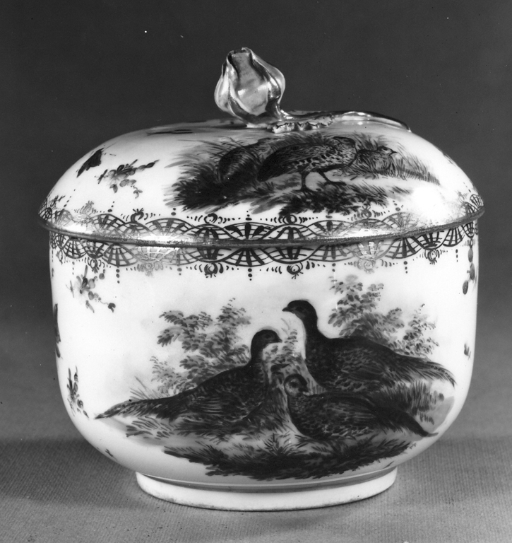 zuccheriera con coperchio. Basso piede circolare, filettato d'oro; corpo cilindrico con, da un lato, raffigurazione di tre pavoni in un paesaggio e, dall'altro, tre fagiani in un paesaggio; intorno, fiori e insetti policromi su fondo bianco; orlo decorato con fascia dorata a merletto