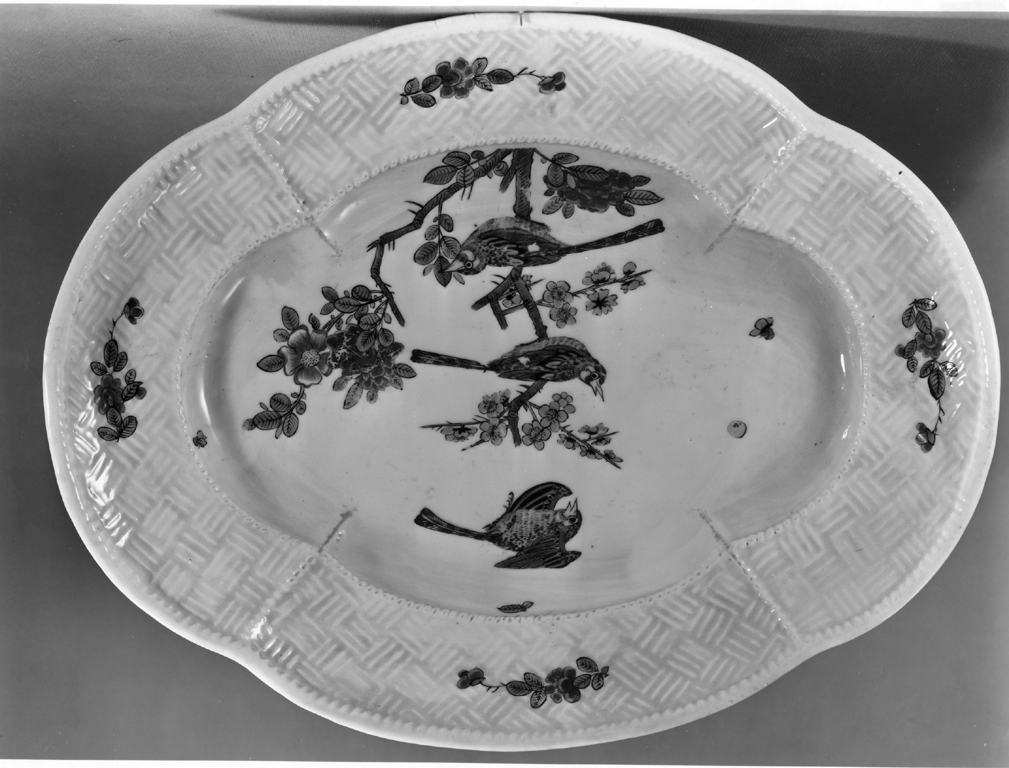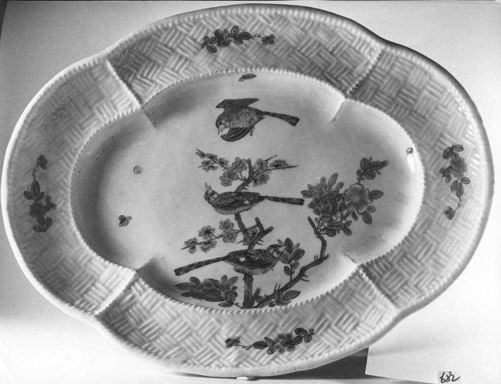 piatto ovale da portata con orlo sagomato e tesa a rilievo che simula l'intreccio di un paniere di vimini; decorato con uccelli su rami fioriti d'ispirazione orientale