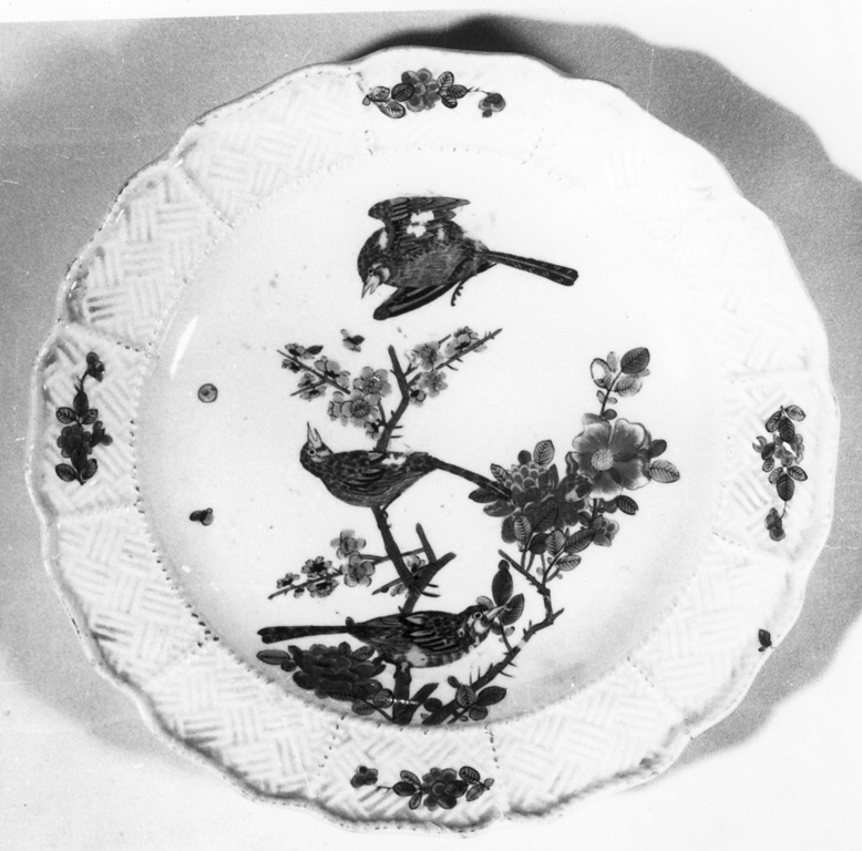piatto circolare con orlo sagomato e tesa a rilievo che simula l'intreccio di un paniere di vimini; decorato con uccelli su rami fioriti d'ispirazione orientale