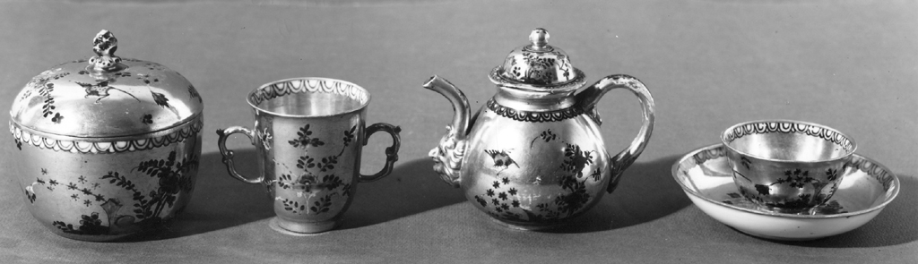 servizio composto da lattiera con coperchio, teiera con coperchio, caffettiera con coperchio, zuccheriera con coperchio, scatola da tè, caraffa, coppa, sei tazzine, sei coppette, sei piattini e vassoio