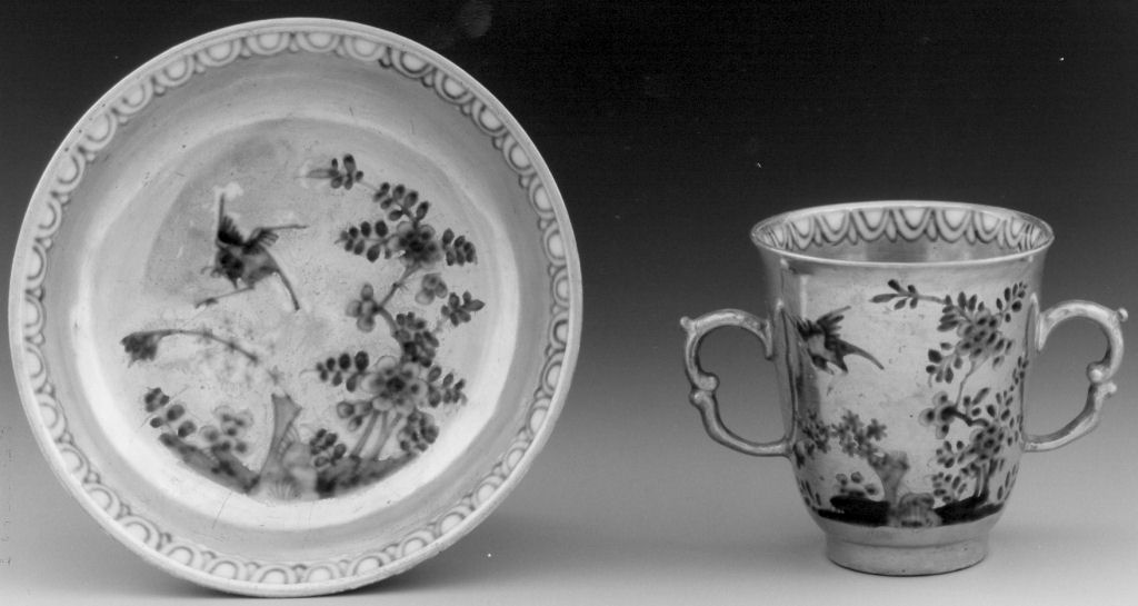piattino con basso piede circolare; interno dorato con fascia a ovuli intorno al bordo e decorazione con motivo a "roccia e uccello" in bianco e blu