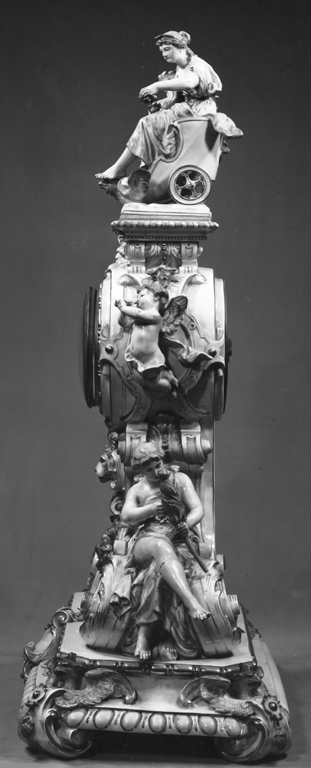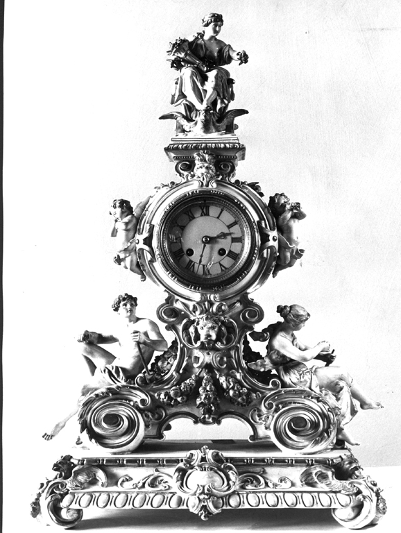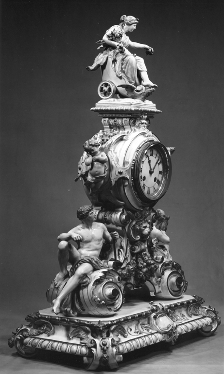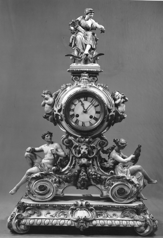 orologio circolare, con quadrante bianco e ore in numeri romani dorati, montato in un corpo in porcellana modellata a volute e figure umane (l'Abbondanza, putti, un uomo e una donna); il corpo è assicurato con viti metalliche a una base quadrangolare, decorata da volute con teste d'aquila e fregi a ovuli