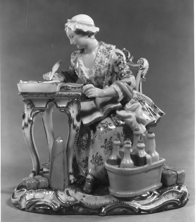 il libro dei conti. dama che scrive con cesto di bottiglie e pacchi