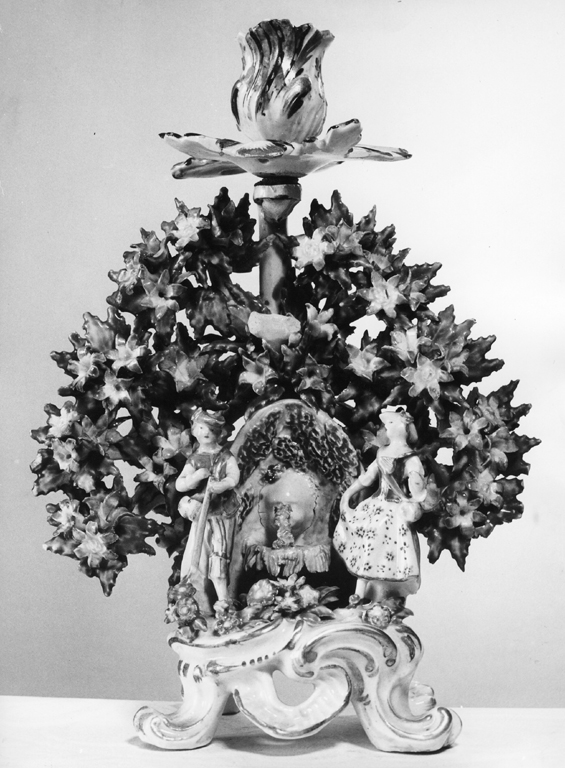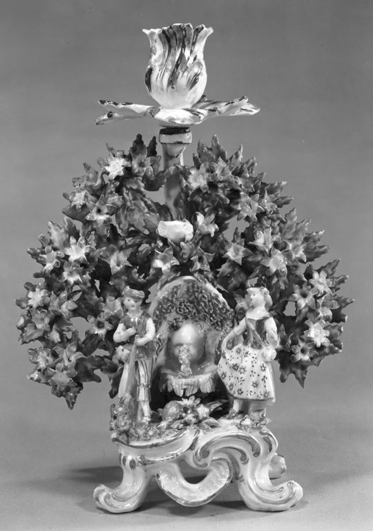 candeliere con porta candele a forma di fiore il cui stelo è inserito in un 'bocage' fiorito alla cui base c'è una fontana con coppia di contadini ai lati