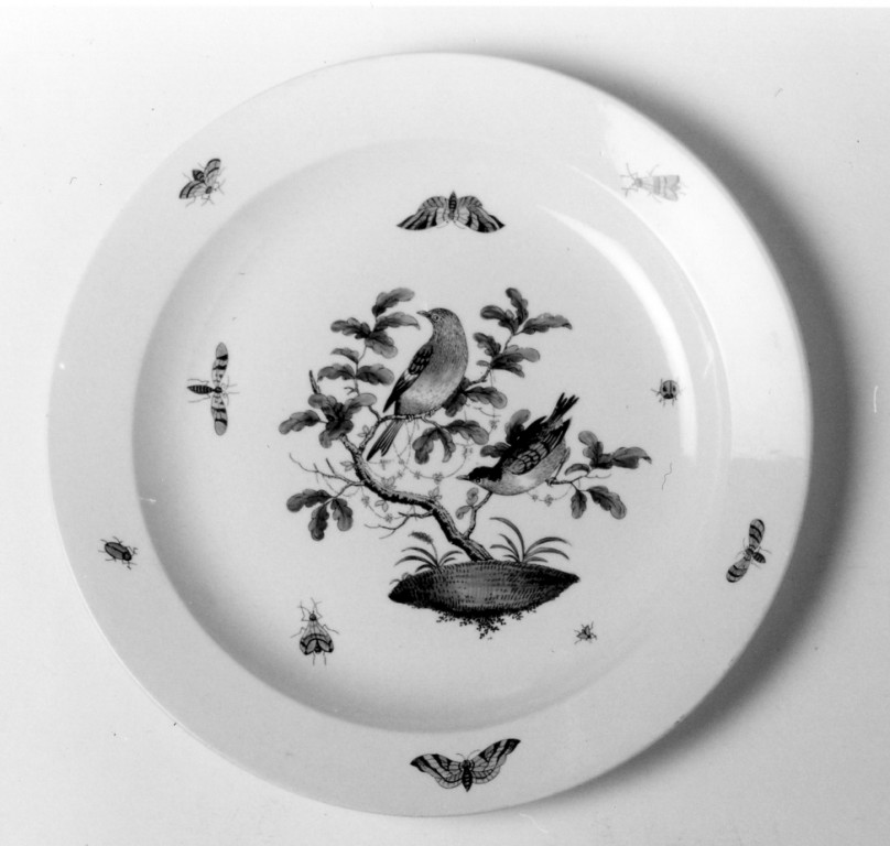 piatto piano circolare con tesa piatta e decorazione a farfalle e insetti sparsi e al centro un albero con uccelli posati sui rami, su fondo bianco