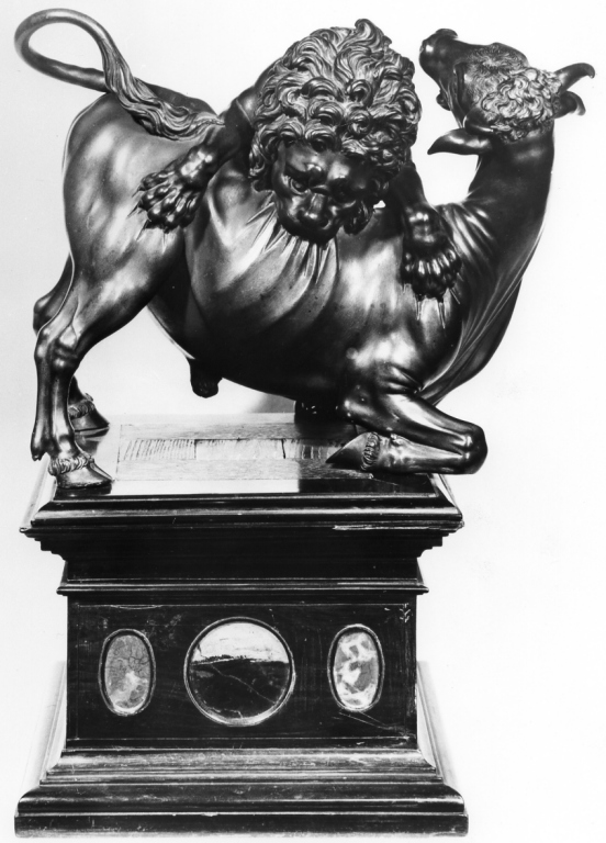 Il gruppo scultoreo poggia su di un basamento rettangolare la cui faccia è caratterizzata da tre inserti marmorei, di forma ovale i laterali, e tonda il centrale