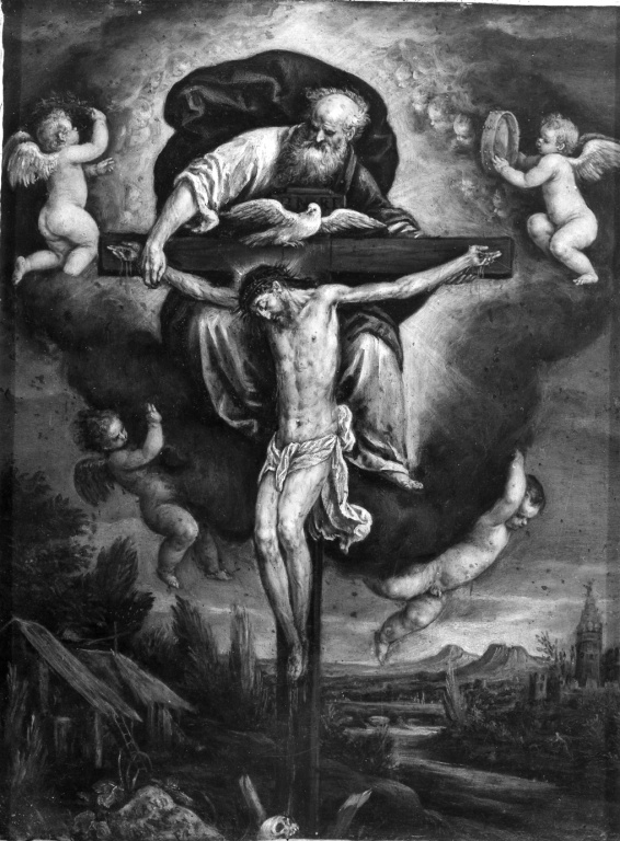 Personaggi: Dio Padre; Gesù Cristo. Figure: angeli. Allegorie-simboli: colomba dello Spirito Santo. Strumenti musicali: tamburello. Oggetti: corona d'allora; teschio; croce. Vedute: veduta di città