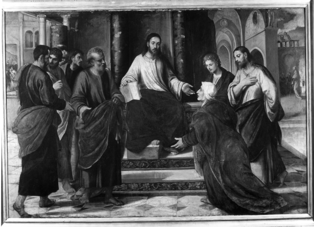 Personaggi: Gesù Cristo; Zebedeo. Figure: famigliari di Zebedeo. Oggetti: libro; trono