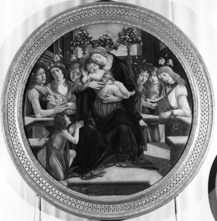 Personaggi: Madonna; Gesù Bambino; San Giovannino. Figure: angeli. Fiori: gigli