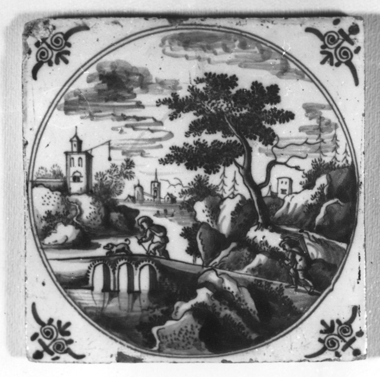Mattonella decorata in cobalto con una raffigurazione racchiusa in un cercho delimitato da una doppia riga