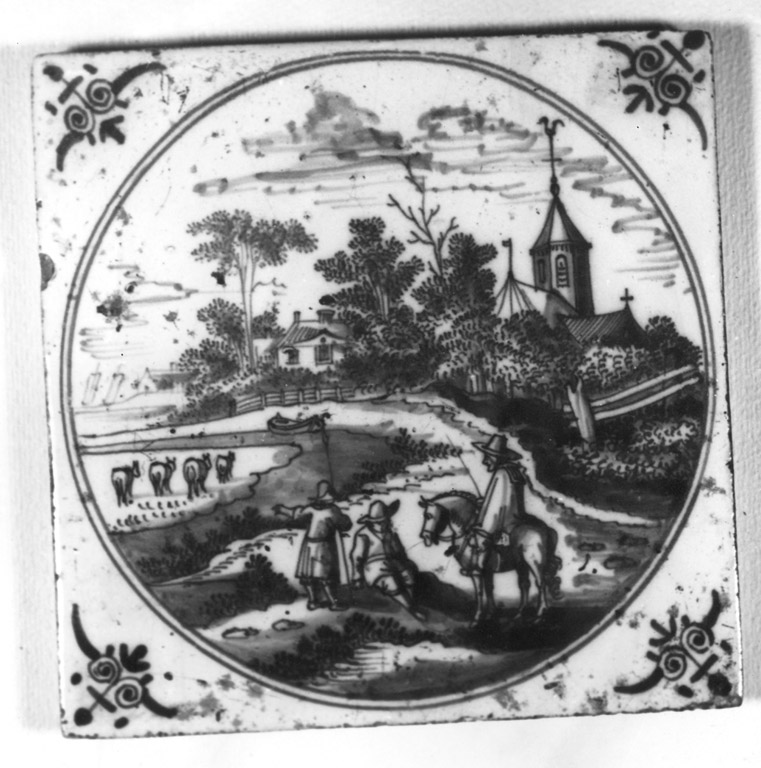 Mattonella decorata in cobalto con una raffigurazione racchiusa in un cercho delimitato da una doppia riga