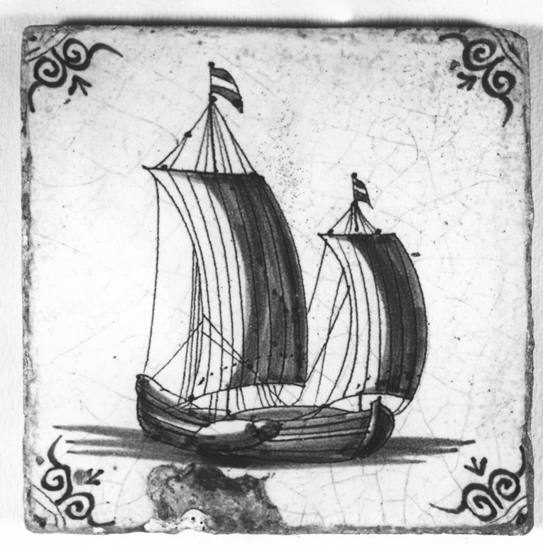 Mattonella decorata in cobalto con la raffigurazione di un veliero a due alberi con le vele alzate. Ai quattro angoli un motivo decorativo di raccordo