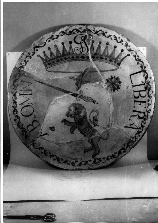 Targa murale circolare, decorata in zallo, ferraccia, cobalto, ramina e manganese con simboli araldici. Smalto terroso