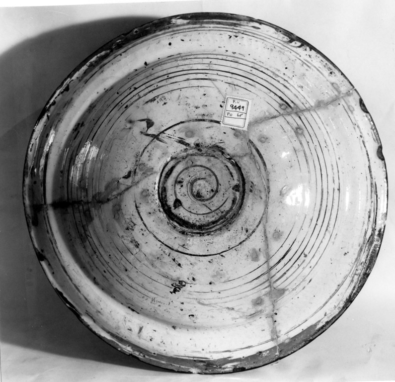 Piatto grande con larga tesa e fondino segnato. Decorato con due fasce concentriche con il motivo a occhio. Al centro rosone con fiore stilizzato ed ornati attorno. Nel retro, fasce concentriche e spirale nel fondino. Riflesso metallico "cobrizo" al 3° fuoco. Cobalto