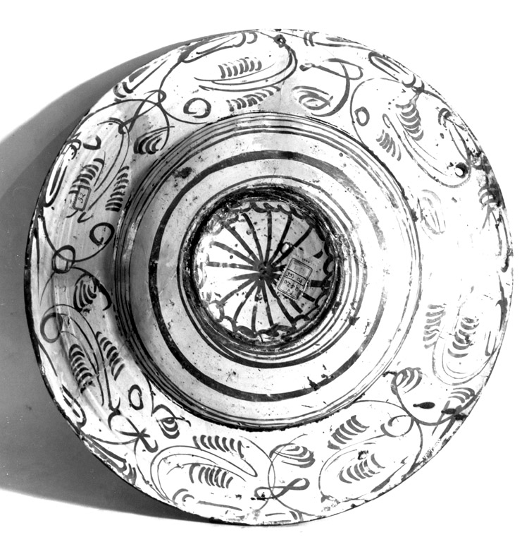 Piatto con tesa larga ed umbone schiacciato, portante un fiore quadrilobato. Su tutta la superficie la decorazione è composta da girali racchiudenti piccoli fiori o quattro losanghe; inoltre suddividono la composizione delle spighette stilizzate e motivi a punto interrogativo. All'esterno, girali con le piume e rosoncino nel fondino. Riflesso aureo al 3° fuoco