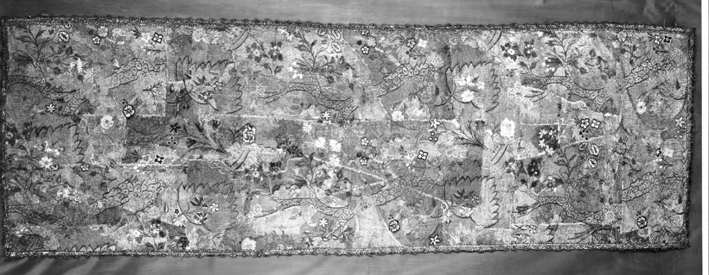 Tessuto in raso viola decorato per trame slegate e trame broccate in argento e fili in seta colorate in due toni. Schema impostato sulle spirali verticali parallele rappresentate da un tronco con rami sui quali si innestano ciuffi di fiori e foglie. Grandi motivi di foglie fantastiche spezzano il tronco riallacciandosi a motivi che ricordano fantastiche conchiglie mentre piccoli mazzi di fiori policromi si innestano quasi motivo di ideale unità, un pò dapertutto