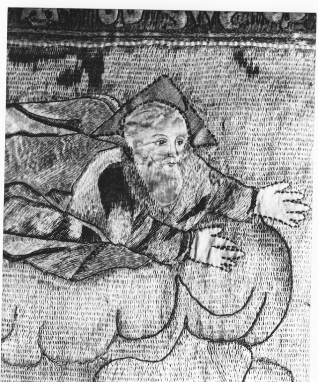 Pannello ricamato decorato con la raffigurazione dell'Uccisione di Abele con al centro l'ara del sacrificio, su cui appare Dio in una nuvola. In basso, a lato dell'altare, Abele morto a destra Caino che fugge. Animali, piante, uccelli riempiono le parti laterali. La bordura, su tre lati, simula foglie di acanto