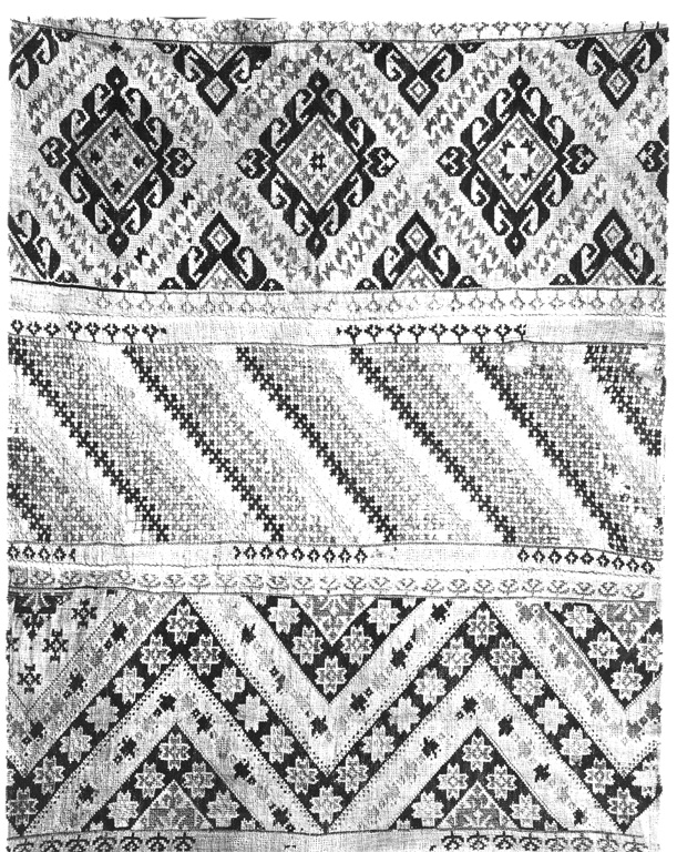 Parte di tovaglia di lino con tre fasce ricamate in seta a punto treccia - scritto, quadrettato. Le fasce sono riquadrate da un motivo di fiori con e senza foglie e presentano: quello centrale con righe diagonali a tinte sfumate, i laterali, uno con motivo di rombi sui cui lati corre una serie di foglie stilizzate e il cui interno è riempito da motivi geometrici, l'altro a fasce di zig-zag riempite da stelle a otto punte e da motivi geometrici. La serie di rosette a punto croce nell'angolo a sinistra è un restauro posteriore. I colori sono: rosso, giallo, viola e avorio
