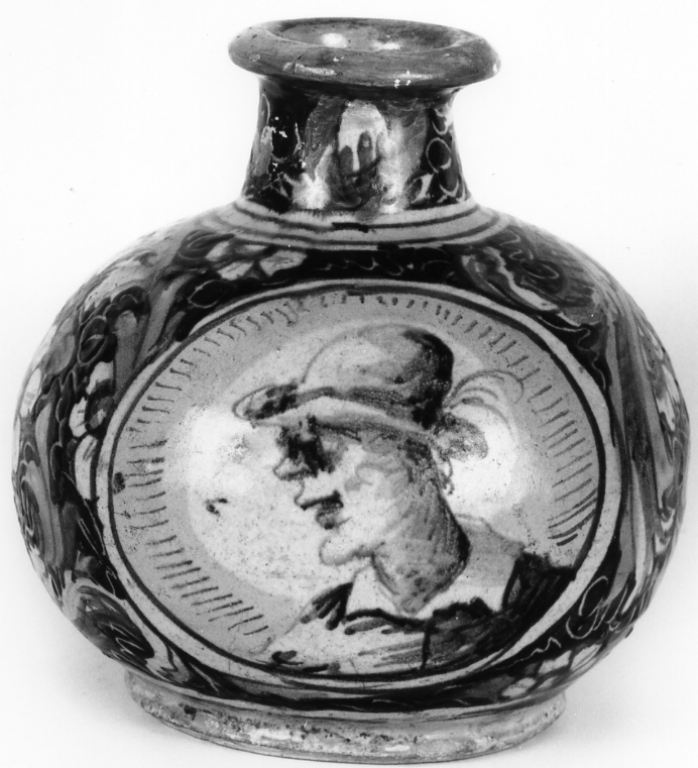Base tonda e bassa. Corpo bombato decorato con due volti maschili entro tondi. Il resto della superficie è decorato con un motivo floreale. Imboccatura stretta e circolare con labbro sporgente
