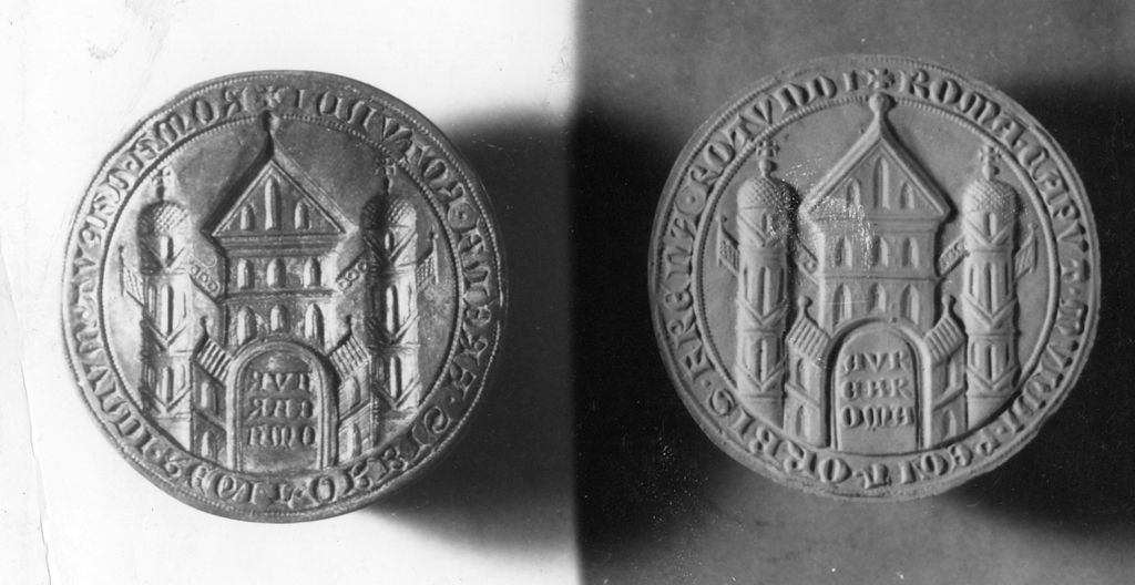 - NOTIZIE STORICO CRITICHE Si tratta del sigillo di Carlo IV (1347-1378). Il suo particolare goticismo e la cura minuziosa dei particolari ci porta a concludere che il maestro incisore dovette essere non italiano, bensì tedesco. In quanto alle torri, esse hanno una tradizione fin dalla bolla di Carlo Magno dell'801. Il verso leonino in lode dell'Urbe è lo stesso che ricorre nella bolla d'oro di Federico I (1153-1190). Cfr. G.C. Bascapé, L'arte del sigillo nel Medioevo e Rinascimento, in "L'arte", n.s., vol. XXVI, 1-2 (1961), p. 6, tav. XIV, 3; Sella, Bolle d'oro dell'Archivio Vaticano, Città del Vaticano 1934, p. 52, tav. VII, 18; C. Cecchelli, Vita di Roma nel Medioevo, Roma 1951, I, pp. 112-115, fig. p. 7; W. Erben, Rombilder auf Kaiserlichen und papslichen Siegeln des Mittelalters, Graz 1931; V. Capobianchi, Appunti per ordin. di monete coniate dal Senato di Roma dal 1184 al 1439 e degli stemmi primitivi del comune di Roma, in "Archivio Soc. Rom. St. Patria", 1895-96 (XVIII-XIX), pp. 417-445 e 75-82, 347-423