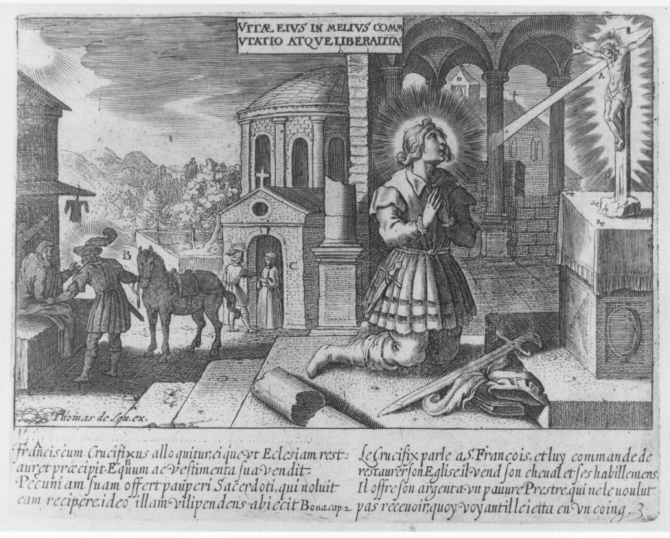 Personaggi: San Francesco. Figure: uomini. Fenomeni divini: aureola; irraggiamento. Simboli: crocifisso. Animali: cavallo. Suppellettili ecclesiastiche: altare. Architetture: negozio; case; archi; plinto; colonna; chiesa; cupola. Oggetti: spadino; spada; cappello; stoffa; libro. Paesaggi: alberi; colline