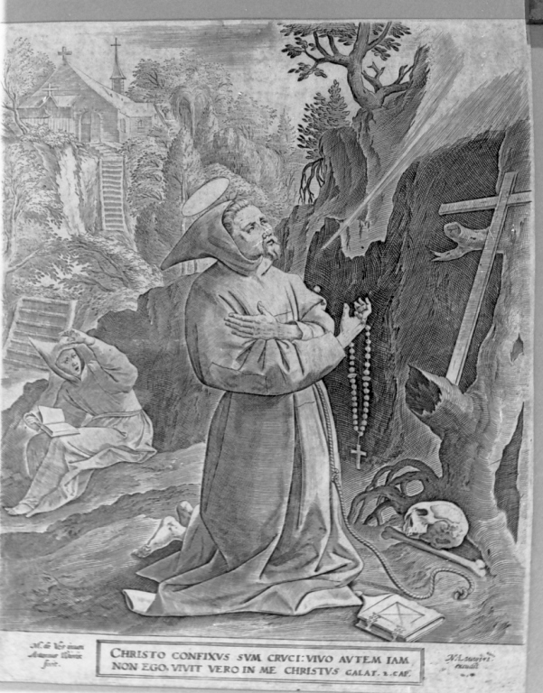 Personaggi: San Francesco d'Assisi. Oggetti: croce; rosario; teschio; libro. Paesaggi: radura. Figure: frate