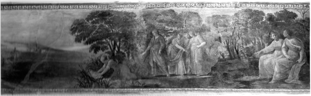 Soggetti sacri: antico testamento. Personaggi: figlia del Faraone; Mosè; ancelle. Figure: figure femminili. Paesaggi