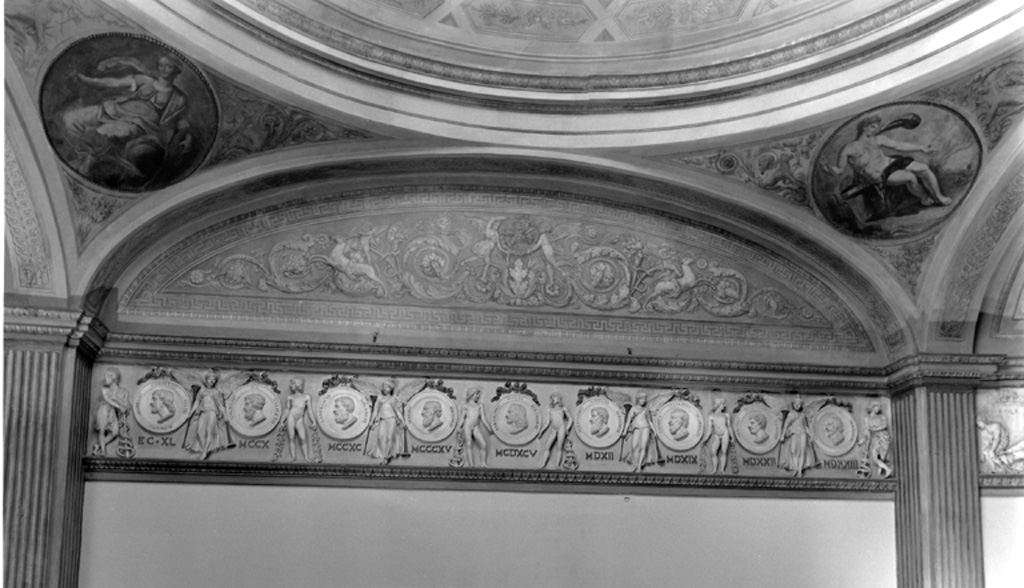 Figure: medici illustri; Allegorie. Oggetti: caducei; festoni. Strumenti musicali