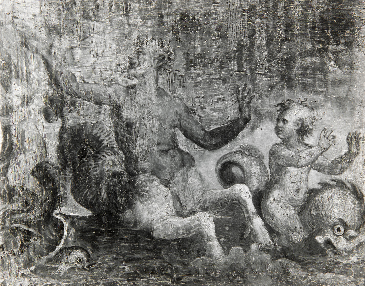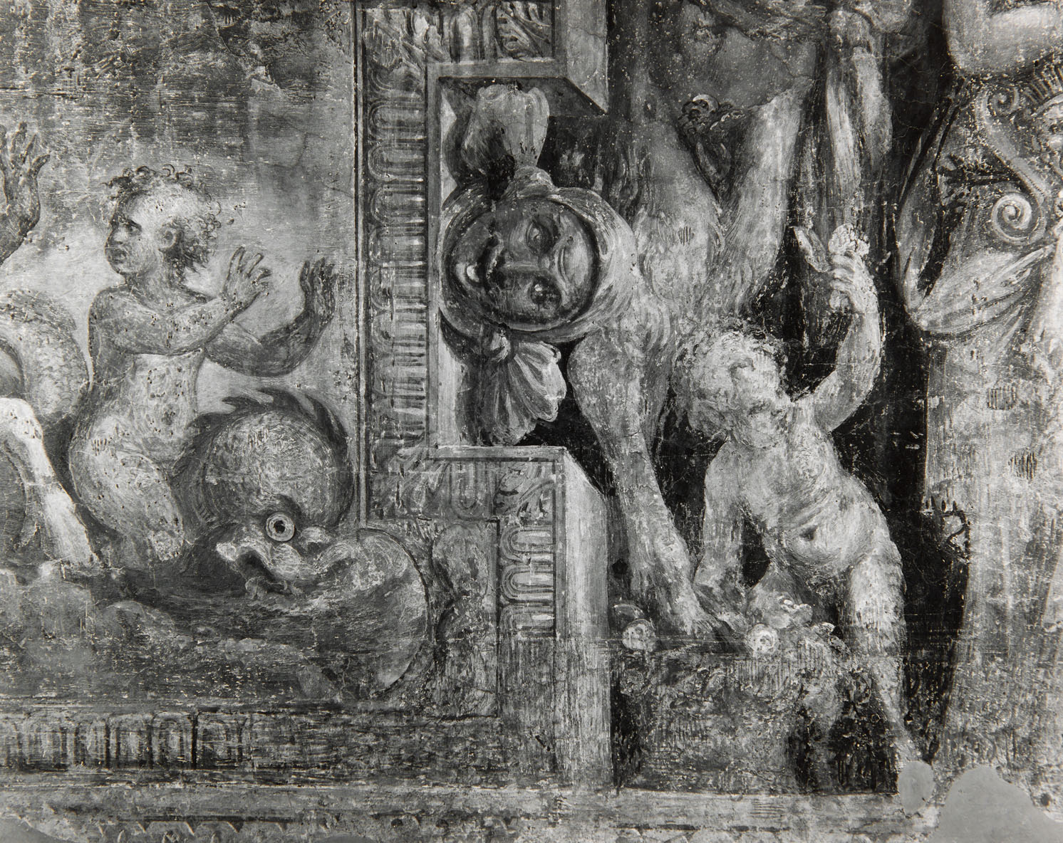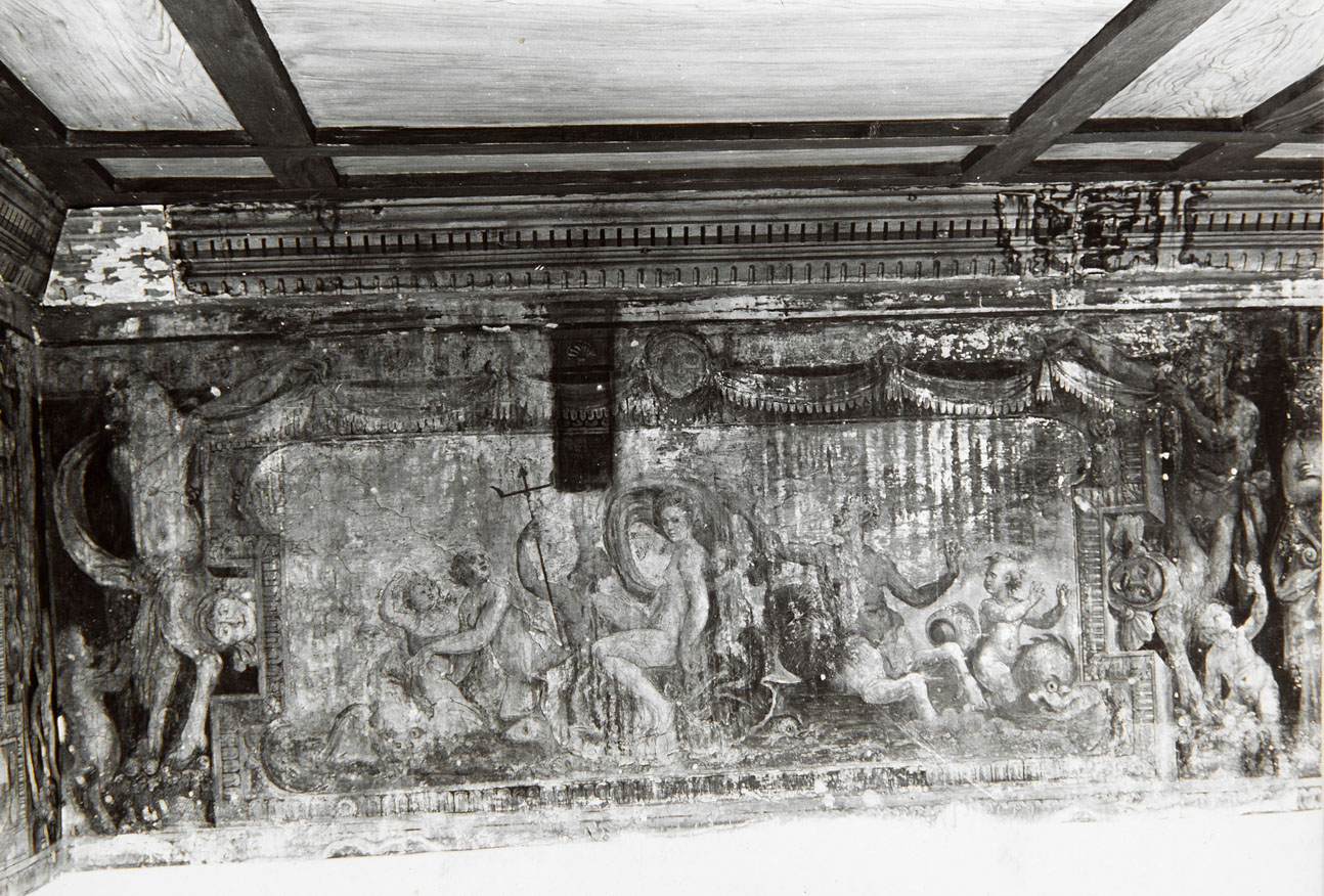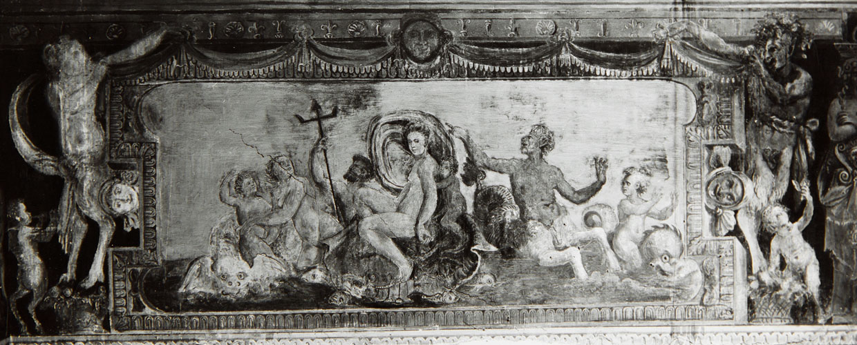 sulla pareste a sinistra, ovest, in due riquadri, è raffigurato, a sinistra, il trionfo di Galatea, a destra il trionfo di Arianna, al centro della parete, tra i due riquadri è la Naumachia di Domiziano