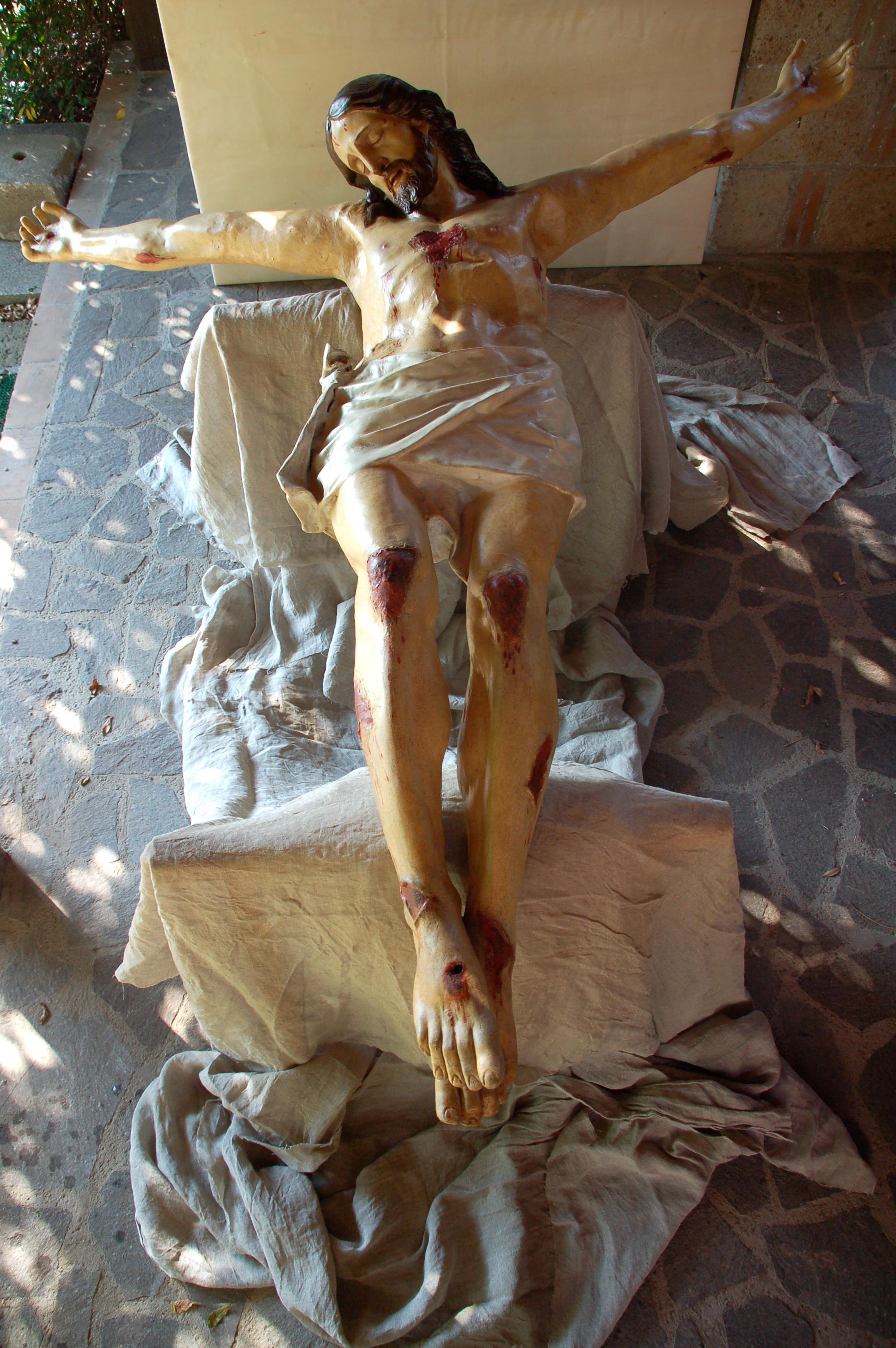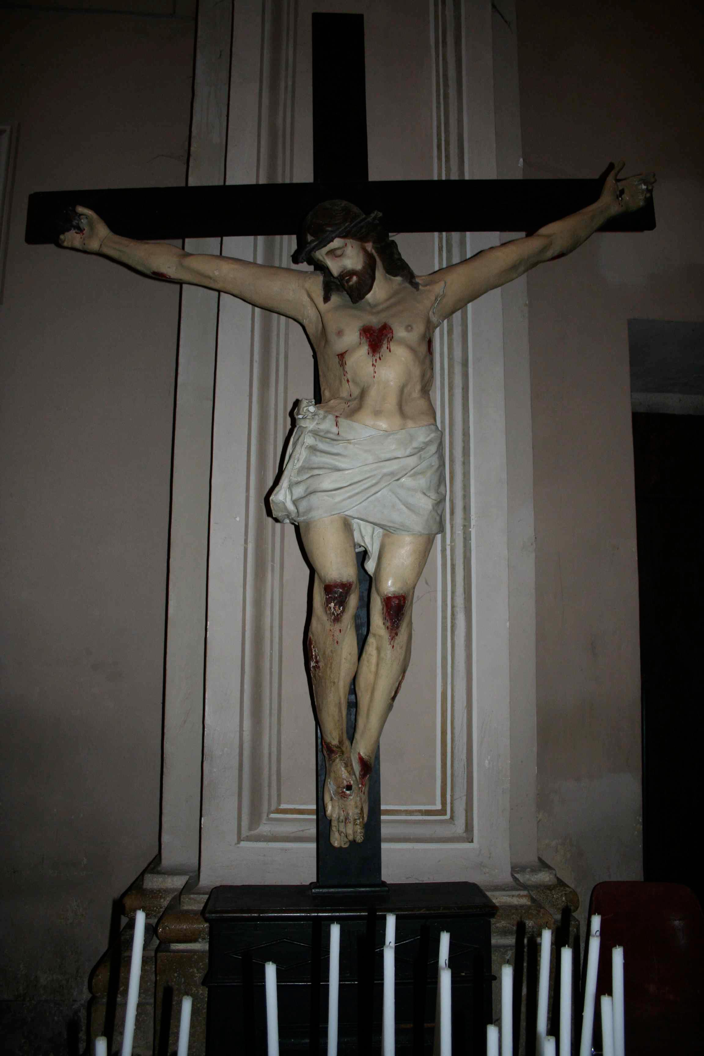 - NOTIZIE STORICO CRITICHE Il crocifisso, inserito nello scasso a fessura di un leggio, è stato oggetto recentemente di un intervento di restauro al fine di reintegrare le parti mancanti. Gli arti superiori erano gravemente lesionati, soprattutto il braccio sinistro, quasi completamente distaccato dal resto del corpo nel punto di innesto alla spalla. Grazie alle indagini stratigrafiche è stato inoltre possibile individuare e ripristinare, al di sotto dei tre strati di ridipintura, la cromia originaria del manufatto