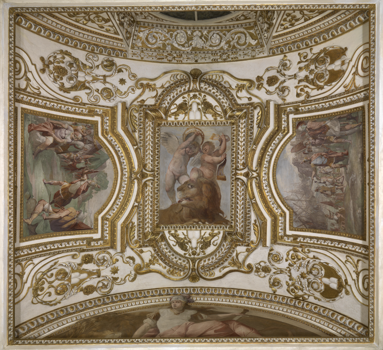 Decorazione di volta a botte con riquadro centrale contenente dipinto di scena allegorica in cornice di stucco dorato a festone culminante superiormente e inferiormente in archi, al cui interno sono due leoni dorati affrontati tenenti rami di pero con frutta e al centro monte a tre colli in stucco bianco sormontato da stella dorata. A destra e a sinistra riquadri lunettati contenenti dipinti storici sormontati da cornice mistilinea decorata da motivi a perle e ovoli e palmette. Le fasce perimetrali della volta sono decorate a girali floreali che racchiudono stelle dorate e monti a tre cime in stucco bianco