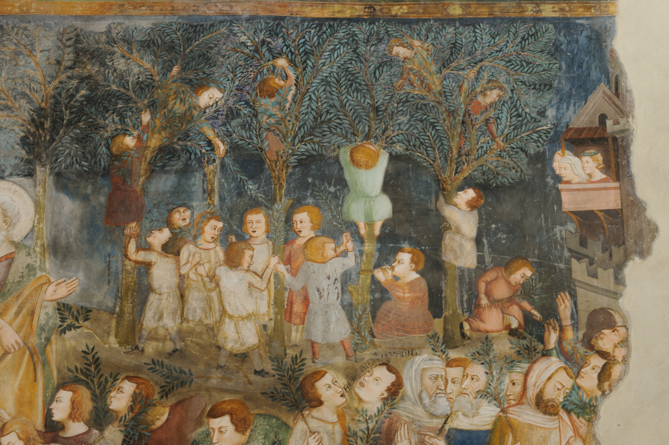 - NOTIZIE STORICO CRITICHE L'episodio dell'"entrata di Cristo in Gerusalemme" appartiene al ciclo di affreschi della prima campata della chiesa superiore del Sacro Speco, che rappresentano "storie della vita di Cristo" inserite in un ricco apparato decorativo caratterizzato da cornicioni finto prospettici e fasce a fregi vegetali intercalati da medaglioni con busti di angeli. La maggior parte degli studi critici hanno attribuito l'impresa pittorica a seguaci di Meo da Siena (Hermanin, 1904; Gnoli, 1923; Van Marle 1925; Coletti, 1941; Toesca, 1951; Offner, 1962), considerandolo un episodio tardo, oltre la metà del XIV secolo se non dopo, forse riferibile al governo dell'abate Bartolomeo II (1362-1369). Si deve a Federico Zeri (Catalogo della VI mostra di restauri dell'Istituto centrale del Restauro, Roma 1948, nn. 82-83) un cambiamento di prospettiva per aver assegnato i dossali conservati nella sacrestia del Scro Speco ad un Maestro dei dossali di Subiaco, attivo in epoca anteriore a quella indicata per gli affreschi in questione, cronologicamente assai prossimo allo stesso Meo da Siena, stimolo per una riconsiderazione attributiva e temporale degli affreschi stessi. Il Boskovits nel 1973 (Pittura umbra e marchigiana fra medioevo e rinascimento, Firenze 1973, pp. 14-15) riafferma la presenza di Meo da Siena, anche se con aiuti, intorno alla metà del terzo decennio XIV secolo, quindi in epoca anteriore a quella tradizionalmente assegnata all'impresa. Nel 1982 Maria Luisa Cristiani Testi (Gli affreschi del Sacro Speco, in I monasteri Benedettini di Subiaco, Milano 1982, pp. 132-191) torna a riproporre la datazione al governo di Bartolomeo II e il riferimento a tardi seguaci del suddetto pittore senese, tra i quali individua almeno tre distinte personalità, guidate da un unico capo bottega che chiama convenzionalmente Maestro Trecentesco. Tra i motivi che spingono la studiosa ad una datazione oltre la metà del XIV secolo c'è anche la considerazione che l'abate Bartolomeo, di origine senese, proveniva da un priorato perugino, elementi che danno ragione della scelta di una bottega quale quella dei seguaci di Meo da Siena, pittore in realtà attivo a Perugia. Qualche anno dopo, invece, Filippo Todini (Pittura umbra dal Duecento al primo Cinquecento, Milano 1989, pp. 134-135) assegna gli affreschi della prima campata a un artista umbro che identifica nello stesso Maestro dei Dossali di Subiaco, indicandone genericamente il periodo di attività entro la metà del XIV secolo. Nel 1992 anche Serena Romano, valutata la questione attributiva secondo le indicazioni di Zeri e Todini, accoglie l'ipotesi di datazione dei dipinti entro la metà del Trecento. La studiosa ritiene difficile trascinare la cronologia fino agli anni '60 del secolo mantenendo intatte e invariate le caratteristiche di stile, considerando che Meo da Siena è documentato a Perugia nel 1319 e che muore prima del 1334 e che l'unica data disponibile per l'opera del Maestro dei Dossali di Subiaco è attorno agli anni '30. La Romano avanza l'ipotesi di una realizzazione degli affreschi prima della peste del 1348, verosimilmente intorno al 1340. Negli anni della Peste Nera, infatti, e in quelli di poco successivi che vedono una violenta crisi nella vita conventuale del Sacro Speco, poi risolta con l'avvento dell'abate Bartolomeo, apparirebbe fuori luogo un impresa così impegnativa, che coinvolse anche altri ambienti del monastero quali la Scala Santa e la Cappella della Madonna
