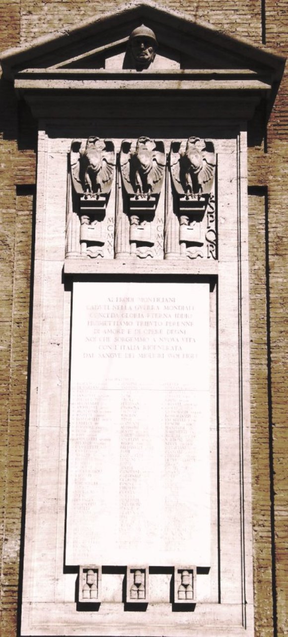 - ISCRIZIONI sulla lapide - AI PRODI MONTICIANI/ CADVDI NELLA GVERRA MONDIALE/ CONCEDE GLORIA ETERNA IDDIO/ PROMETTIAMO TRIBVTO PERENNE/ DI AMORE E DI OPERE DEGNE/ NOI CHE SORGEMMO A NVOVA VITA/ CON L'ITALIA RIGENERATA/ DAL SANGVE DEI MIGLIORI SVOI FIGLI// S.TEN. MAZZARESI CARLO MEDAGLIA D'ORO// MAGG. ROMANO LORENZO/ CAP. DE GAETANI ENRICO/ / " FANTI FILIPPO// " PANDOLFI GIOVANNI/ / " PELLI EGISTI GLOTTO/ TEN. ALESSANDRI LVIGI/ / " AMMILLERI GIVLIO/ " AVOGADRO GIVSEPPE/ " BINOTTI AMEDEO/ " DOTTARELLI PIETRO/ " LADELCI PIO/ " PORZIOLI ANGELO/ " ROSSI ALBERTO/ " RAPI CESARE/ S.TEN. AMILLERI GIVSEPPE/ " BELARDI VIRGILIO/ " CAMILLETTI VGO/ " CVRTI LVUIGI/ " MVULLER PASQVALE/ " PIEROTTI FERDINANDO/ " ROSSELLI VMBERTO/ " SCOCCHI ARMANDO/ " STRAMIGGIOLI ITALO/ "VACCARI VGO / ASP. BOFFI LAMBERTO/ " MAGAGNOLI GOFFREDO/ " SAMPOLI VMBERTO/ SERG.M. ANGELONI GIOVANNI/ " BERNI MICHELE/ SERG. BERANGER RENATO/ " CARDAMINI ROBERTO/ " CAPELLI GVUGLIELMO/ "GENNARI ROMEO/ " GIGLI RENATO/ " GVARDUCCI TOMMASO/ " PEROTTI ARMANDO/ " PERVGINI ANTONIO/ " SCALZAFERRI VINCENZO/ TEN. DEL BVTTERO RENATO/ S.TEN. DEL BVTTERO GINO/ " DE MORI ALESSANDRO/ " RICCIONI GIOSAFAT/ AIV.D.BAT D'ALENA GIVSEPPE/ TEN STETTINER TORQVATO/ S.TEN COMPAGNA PIETRO/ " GARGIVLO GIVLIO/CAP. MANCINI LVIGI / EN. BAMBINI LVIGI/SERG. SONGINI MARIANO/ " VARRONI NICOLA/ CAP.M. ROSSI CHERUBINO/ " ROSSI LVUIGI/ CAP. AMORE VINCENZO/ " BEVIGNANI ANTONIO/ " CREMONA CARLO/ " ESPOSITO LVIGI/ " MAGRINI GVIDO/ " TERZI GIVSEPPE/SOLD. ALIMENTI ESPARTERO/ " ALTISSIMI VMBERTO/ " ALVITI GIVSEPPE/ " AMICI DOMENICO/ " ANGELINI MARCO / " AVERSI VMBERTO/ " BALDASSARI MARIO/ " BASSI ANTONIO/ " BATTARELLI FAVSTO/ " BENIGNI DESIDERIO/ " BOZZI MARIO/ " BRVSTIO VMBERTO/ " CANOFANI ATTILIO/ " CARDINALI MARIANO/ " CETRONI CESIDIO/ " CINQVE FRANCESCO/ " CIROTTI LVIGI/ " COCCIA ANGELO/ " COCCIA AVGVSTO/ " CONFORTI RAFFAELLO/ " CVCODORO GAETANO/ " D'AMBROSI ORAZIO/ " DE BERNARDIS PAOLO/ " DELLA ROVERE OTELLO/ " DE ROSSI ERNESTO/ " ELISEO RAFFAELE / " EVANGELISTI ROMOLO/ " FIORI CESARE/ " CASTELLINI MARIO/ " ANDREOTTI RAFFAELE/ CAP-M BISSATTINI FELICE/ SOLD. LVPACCINI COLOMBO / SOLD. GENTILI MARIO/ GIACOMELLI VITTORIO/ GIVNTI ROMOLO / IGHILI VITTORIO / SOLD. FLERES SALVATORE/ " FONTANA ROMOLO/ " GABRIOTTI LVUIGI/ " GASPERI VMBERTO/ " GHINI TVLLIO/ " GIGANTI AGOSTINO/ " GRILLI GIVSEPPE/ " GVIDOBALDI CVRZIO/ " LOMBARDOZZI ANTONIO/ " LVCARELLI BRVNO/ " LVNGHI DOMENICO/ "MANFRONI RENATO/ " MARCHETTI RINALDO/ " MISELLI GIOVANNI/ "NARDONI SILVIO/ " NECCI FEDERICO/ " OTTAVIANI ANGELO/ " PASQVALI ARRICO/ " PEDVSSIA VITTORIO/ " PICCHI-GOLVCCI GIOV./ " PILOZZI ALFREDO/ " RASTELLINI PIETRO/ " RIPANTI FERNANDO/ " ROMITI CESARE/ " ROSSI DOMENICO/ " RVGGERI ETTORE/ " SCARPETTI CESARE/ " STECCHIOTTI GIVSEPPE/ " TEMPORINI NICOLA/ " TESORI NAZZARENO/ " TROMBETTA MARIO/ " TRIMA ANTONIO/ " VGHI MARIO/ " VICHI ROMOLO/ " ZANNONI NORBERTO/ " ZANNOTTI FRANCESCO/ " BIANCHINI ERNESTO/ " MONTANI FERNANDO/ " MONTANI ITALO/ " BVCCIOLI LVIGI/ S.TEN. CASAPIETRA UMBERTO// SOLD. MARFANI VIRGILIO / IANELLA GVSTAVO/ STEFFOLANI ROMOLO/ GALLETTI NVLLO// ARCH O FREZZOTTI - capitale -