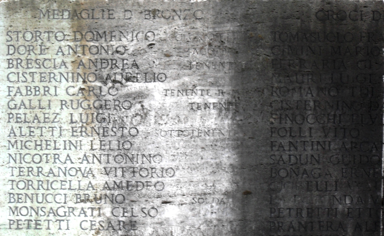 - ISCRIZIONI sul basamento - ...// ORIO S COLONNELLO/ BARRIERA GIUSEPPE TENENTE/ MABERTI SILVIO TENENTE/ MALAGOLI UMBERTO "/ MARANI MARIO "/ REBECCHI VIRGINIO "/ ROMANO REMO "/ VENTANI ALDO "/ BARTOLOMEI CARLO SOTTOTENENTE/ BOCCACCI FILIBERTO PILOT. AVIATORE/ CELEGATO SERGIO SOTTOTENENTE/ D'AMICO RENO "/ DATI BIAGIO "/ DE MALDE EZIO "/ GERMANO NELIO "/ GIUFFREDA FRANCESCO "/ MIATTON REGOLO "// PISANI ITALO "/ POLITI ARRIGO "/ PRIMO ALFREDO "/ ZAPPAIA VINCENZO "/ MASSETTI EMILIO "/ SERGIO GIULIO MARESCIALLO/ ABATI GULI ALABARDO SERG. MAGG/ FALCONI DANILO .../ MARCONI UGO FOSCOLO SERGENTE/ MESSERI MARIO CAPORALE/ PERRONI MARIO "/ FALANGOLA RENATO SOLDATO/ MASCI AUGUSTO "// MEDAGLIE DI BRONZO/ STORTO DOMENICO COLONNELLO/ DORE ANTONIO .../ BRESCIA ANDREA TENENTE/ CISTERINO AURELIO "/ FABBRI CARLO TENENTE .../ GALLI RUGGERO TENENTE/ PELAEZ LUIGI "/ ALETTI ERNESTO SOTTOTENENTE/ MICHELINI LELIO "/ NICOTRA ANTONINO "/ TERRANOVA VITTORIO "/ TORRICELLA AMEDEO "/ BENUCCI BRUNO SOLDATO "/ MONSAGRATI CELSO "/ PETETTI CESARE "// CROCI DI GUERRA "/ TOMASUOLO FRANCESCO COLONNELLO/ CIMINI MARIO CAPITANO/ FERRARIA G.../ MAURI LUIGI/ ROMANO TULLIO "/ CISTERNINO DANTE TENENTE/ FINOCCHI ELVIDIO "/ FOLLI VITO "/ FANTINI ARCANGELO "/ SADUN GUIDO "/ BONAGA ERNESTO SOTTOTENENTE/ ...RELLI .../ LA ROTONDA VITTORIO "/ PETRETTI ETTORE "/ PRANTERA ALFONSO "/ RICCI NICOLA CAPITANO//...// PROIETTI GIULIO SERG. MAGG./ RICCI GASTONE CAPOR./ ...GUGLIELMO CAPOR./ ...ENRICO "/ ...PIETRO "/ ...AUGUSTO SOLDATO/ BARTOLUCCI ROMOLO "/ BERANDO ATTILIO "/ BRACCIONI ADOLFO "/ BRUSCOLI FAUSTO "/ BUFACCHI ETTORE "/ BURETTA NELLO "/ BUSTI ERMANNO "/ CUOZZO GIUSEPPE "/ D'ALESSANDRO GIOVANNI "/ DE CAROLIS ARMANDO "/ DEL PRINCIPE PAOLO "// FERRANTI GIULIO SOLDATO/MONTESI GINO "/ BOCCITTO GIUSEPPE SOLDATO/ BOGINI VINCENZO "/ BUDICCHI CESARE "/ BUFACCHI ADRIANO "/ CAMINATI AUGUSTO "/ CARMOSINO NICOLA "/ CARUFFI TORQUATO "/ CASOLINI ALDO "/ CASORRI GIUSEPPE "/ CATASCA VITTORIO "/ CECCHETTI UMBERTO "/ CECCONI PIETRO "/ CENTINI PIETRO "/ CHERUBINI GIOTTO "/ CIACCI DOMENICO "/ COLANTONI AURELIO "// PACI FERNANDO SOLDATO/ BARELLI LEOPOLDO/ CILLI DOMENICO SOLDATO/ CIRIONI QUINTO "/ COTICONI GIUSEPPE "/ CRISPINO FRANCESCO "/ D'AMATO ALBERTO "/ DE CICCO ANTONIO "/ DELFINI ANTONIO "/ DEL GRECO LUCIANO "/ DE MEI ALBERTO "/ DI CARLO SABATINO "/ DI PAOLA VINCENZO "/ ESPOSTO EDOMONDO "/ FALCIONI GIUSEPPE "/ FLORENZIS ROMOLO "/ GARATTONI ANGELO "/ GENTILI ADRIANO// GIRARDI LUIGI SOLDATO/ GIOVANNINI MANLIO "/ GORRI FRANCESCO "/ JANNOTTI AUGUSTO "/ LIONARDI ANGELO "/ MAOLINI FRANCESCO "/ MARINELLI CESARE / MARTINI ANGELO "/ MASI BRUNO "/ .../ ONORATI GIUSEPPE "/ OTTAVIANI ERNESTO "/ PARDO PURINO "/ PARISI ARMANDO " // PIGNANI GINO SOLDATO/ POLENTINI LUIGI "/ POMA ERMA "/ ROSSETTO DOMENICO "/ SAVIO GIULIO "/ SCARABOTTI ARNALDO "/ SPATURNA MARIANO CARABINIERE/ STANGHI FILNAZZA RINO SOLDATO/ TIBERI ORLANDO "/ TIRINNANZI ELIO "/ TIRINNANZI UMBERTO "/ TRAVERSLITI LUIGI RUGGIERO "/ TEMULILLO ENRICO "/ VERDINI GASTONE "/ VIGNALI FRANCESCO "/ ZACCARIA IVO "//.. - caratteri vari -