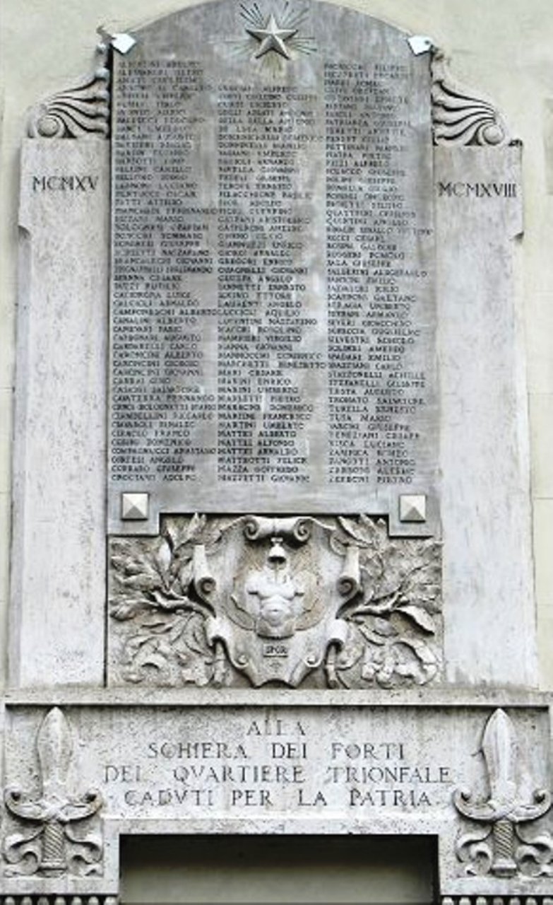 - ISCRIZIONI sulla lapide - MCMXV// MCMXVIII// ALBERTINI ARTURO/ ALESSANDRI PIETRO/ AMATI GUGLIELMO/ ANTONELLI CAMILLO/ ARZILLI UMBERTO/ AUSILI ITALO/ AVONTO MARIO/ BALDUCCI RODOLFO/ BANCI UMBERTO/ BALSANI AUGUSTO/ BARBIERI EMILIO/ BARDIN EUGENIO/ BARSOTTI DINO/ BELLINI CAMILLO/ BELLOMO IGINIO/ BERNONI LUCIANO/ BERTUCCI OSCAR/ BETTI ATTILIO/ BIANCHEDI FERDINANDO/ BIZZARRI MARIO/ BOLOGNESI OBERDAN/ BONCORI TOMMASO/ BORGHESI GIUSEPPE/ BORSETTI NAZZARENO/ BRANCALEONI GIOVANNI/ BRIGNARDELLI FERDINANDO/ BRENNA CESARE/ BUZZI RUTILIO/ CACIORNA LUIGI/ CALCIOLI ARNALDO/ CAMPONESCHI ALBERTO/ CANALINI ALBERTO/ CANEVARI FABIO/ CARBONARI AUGUSTO/ CARDARELLI CARLO/ CARONCINI ALBERTO/ CARONCINI GIORGIO/ CARONCINI GIOVANNI/ CARRAI GINO/ CASADEI SALVATORE/ CAVATERRA FERNANDO/ CENCI BOLOGNETTI MARIO/ CIAMBELLINI RICCARDO/ CIAVAROLI RINALDO/ CIRAOLO FRANCO/ CODINI DOMENICO/ COMPAGNUCCI ANASTASIO/ CORTESI ANGELO/ CORRARO GIUSEPPE/ CROCIANI ADOLFO// CRUCIANI ALFREDO/ CURTI GIALDINO GIUSEPPE/ CURZI UMBERTO/ DEGLI ABBATI ANTONIO/ DELLA BELLA ANTONIO/ DE LUCA MARIO/ DOMENICHELLI DOMENICO/ DONNINELLI MANLIO/ FAGIANI UMBERTO/ FAGIOLI ARNANDO/ FAVELLA GIOVANNI/ FEDELI GIUSEPPE/ FEROCE ERNESTO/ FILACCHIONE BASILIO/ FIORI ADOLFO/ FIORI GUERRINO/ GALEANI ARISTODEMO/ GASPERONI AMEDEO/ GHENO SILVIO/ GIANNUZZI ENRICO/ GIORGI ARNALDO/ GREGORI ENRICO/ GUAGNELLI GIOVANNI/ GUELPA ANGELO/ IANNETTI ERNESTO/ IOVINO ETTORE/ LAURENTI ANGELO/ LUCCIOLI AQUILIO/ LUCENTINI NAZZARENO/ MACORI ROSOLINO/ MAMPIERI VIRGILIO/ MANNA GIOVANNI/ MANNOCCHI DOMENICO/ MARCHETTI BENEDETTO/ MARI CESARE/ MARINI ENRICO/ MARINI UMBERTO/ MARLETTI PIETRO/ MARRONE DOMENICO/ MARTINI FRANCESCO/ MARTINI UMBERTO/ MATTEI ALBERTO/ MATTEI ALFONSO/ MATTEI ARNALDO/ MATTEOTTI FELICE/ MAZZA GOFFREDO/ MAZZETTI GIOVANNI// MORICONI FILIPPO/ MOZZETTI EDOARDO/ NARDI ROMEO/ OLIVI OBERDAN/ OTTAVIANI ERMETE/ PANZANI MARINO/ PAROLI ANTONIO/ PATRIARCA GIUSEPPE/ PERETTI ARISTIDE/ PERRET GIULIO/ PETTINARI MANLIO/ PIATRA PIETRO/ PIZZI ALFREDO/ POLACCO GIUSEPPE/ POLINI GIUSEPPE/ POMELLA GIULIO/ POMPEI OMOBONO/ PROIETTI FILIPPO/ QUATTRINI GIUSEPPE/ QUINTINI ANGELO/ RINALDI RINALDO VITTORIO/ ROCCI CESARE/ ROSINA GASPARE/ RUGGERI ROMOLO/ SALA GIUSEPPE/ SALBERINI ALDOBRANDO/ SANTONI EMILIO/ SALVATORI ICILIO/ SCARPONI GAETANO/ SERAGIA UMBERTO/ SERRANI ARMANDO/ SEVERI GIOACCHINO/ SGRECCIA GUGLIELMO/ SIVESTRI ROMOLO/ SOLIMEI AMEDEO/ SPADARI EMILIO/ SPAZZIANI CARLO/ STAZZONELLI ACHILLE/ STEFANELLI GIUSEPPE/ TESTA AUGUSTO/ TRONATO SALVATORE/ TURELLA ERNESTO/ TUSA MARIO/ VARCHI GIUSEPPE/ VENEZIANI CESARE/ VISCA LUCIANO/ ZAMPICA ROMEO/ ZANOTTI ANTONIO/ ZERBONI ALTERIO/ ZERBONI PIETRO - capitale - a incisione -